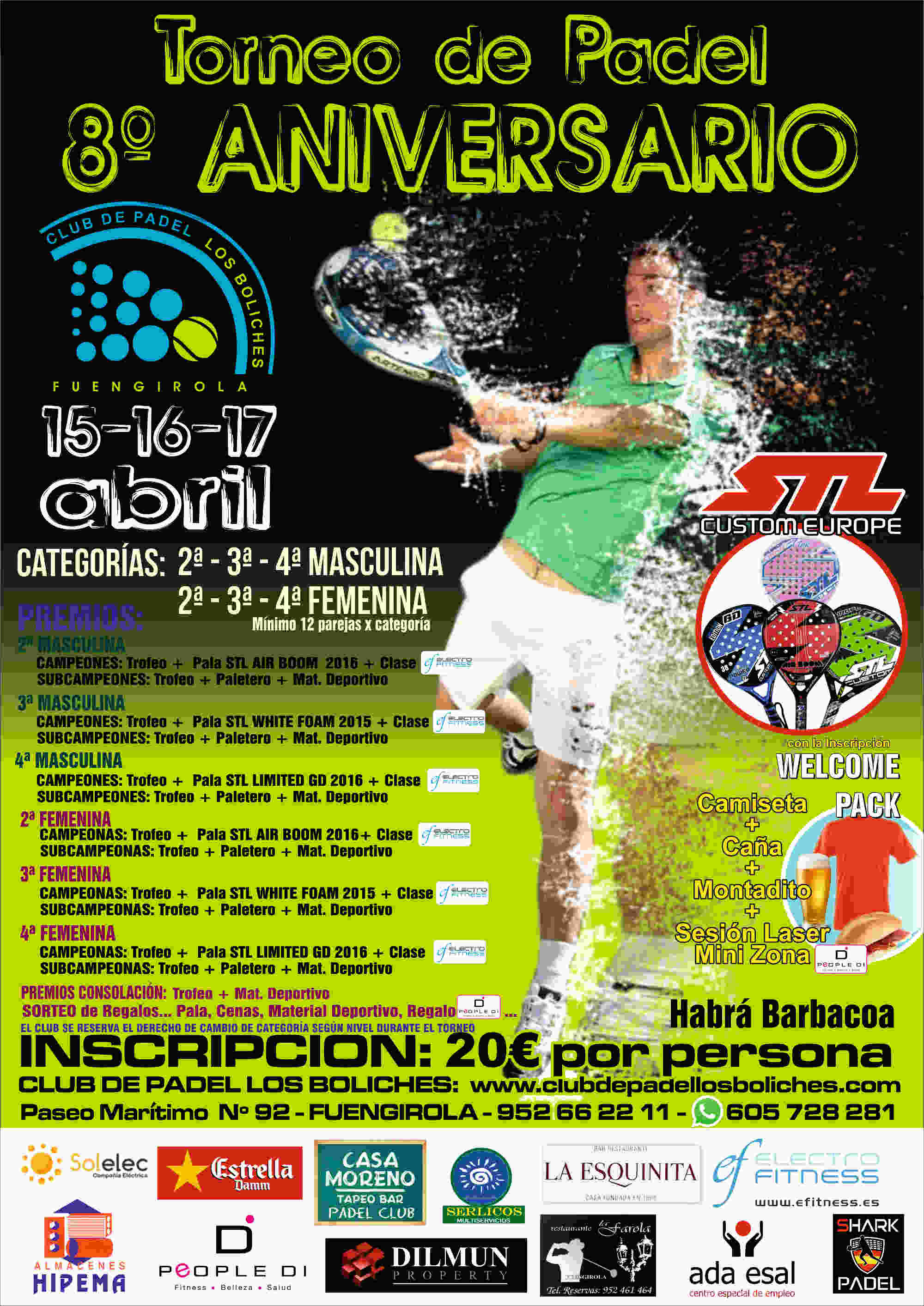 Premios: Palas STEEL CUSTOM, Trofeos, Bonos ElectroFitness, Paleteros y Material Deportivo